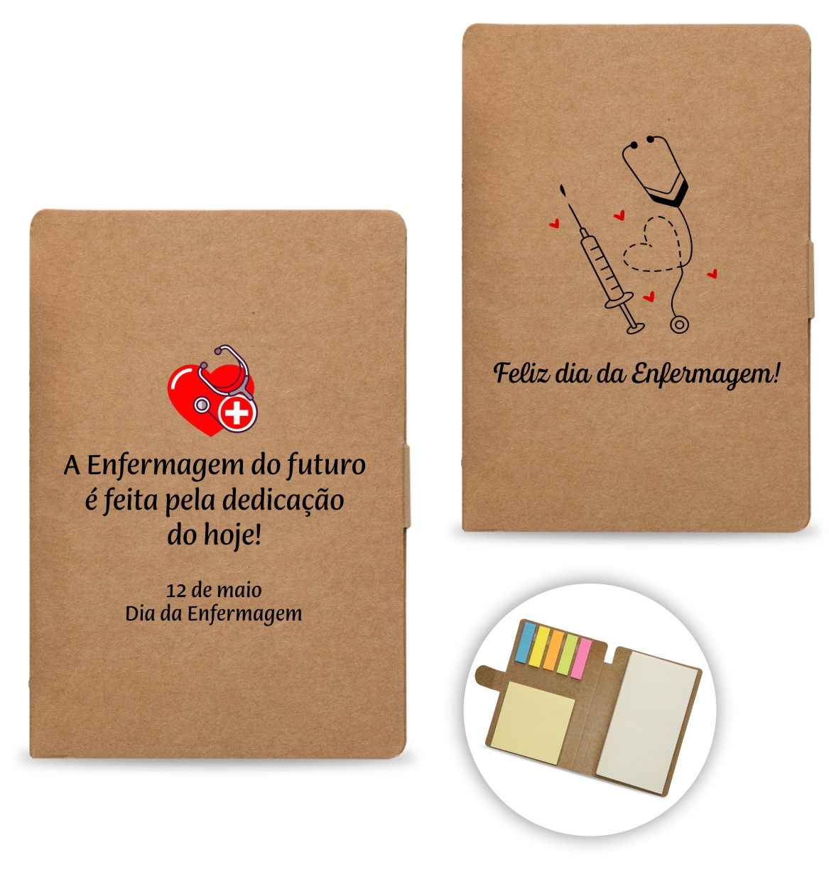 Bloco de anotações ecológico, material em kraft. Possui uma trava na própria capa, cinco blocos autoadesivos coloridos com aproximadamente 25 folhinhas , bloco autoadesivo amarelo com aproximadamente 25 folhas e bloco grande com aproximadamente 70 folhas.