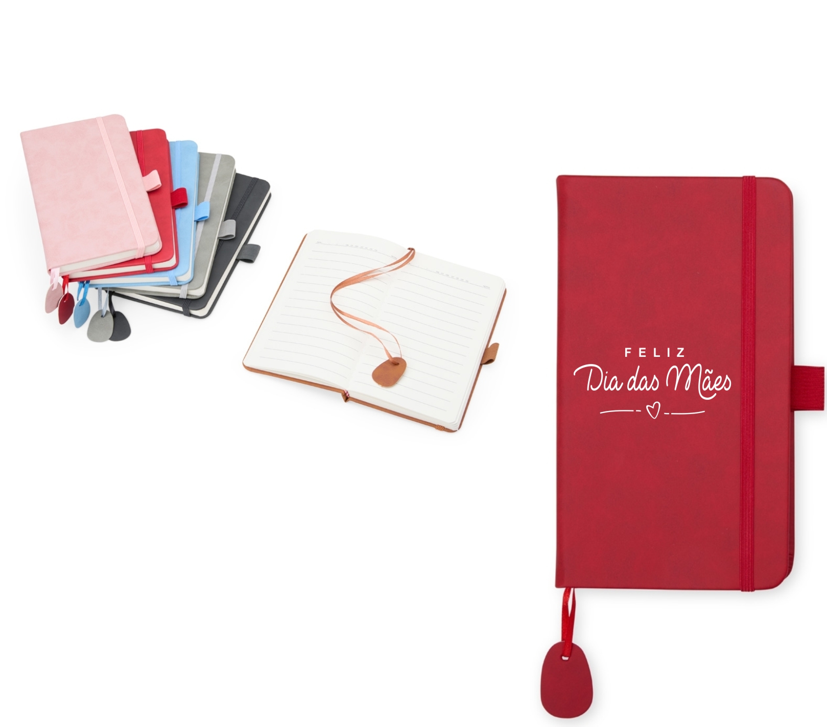 Com capa emborrachada, suporte para caneta em nylon, elástico para fechamento e fita de cetim com etiqueta e espaço para personalização.