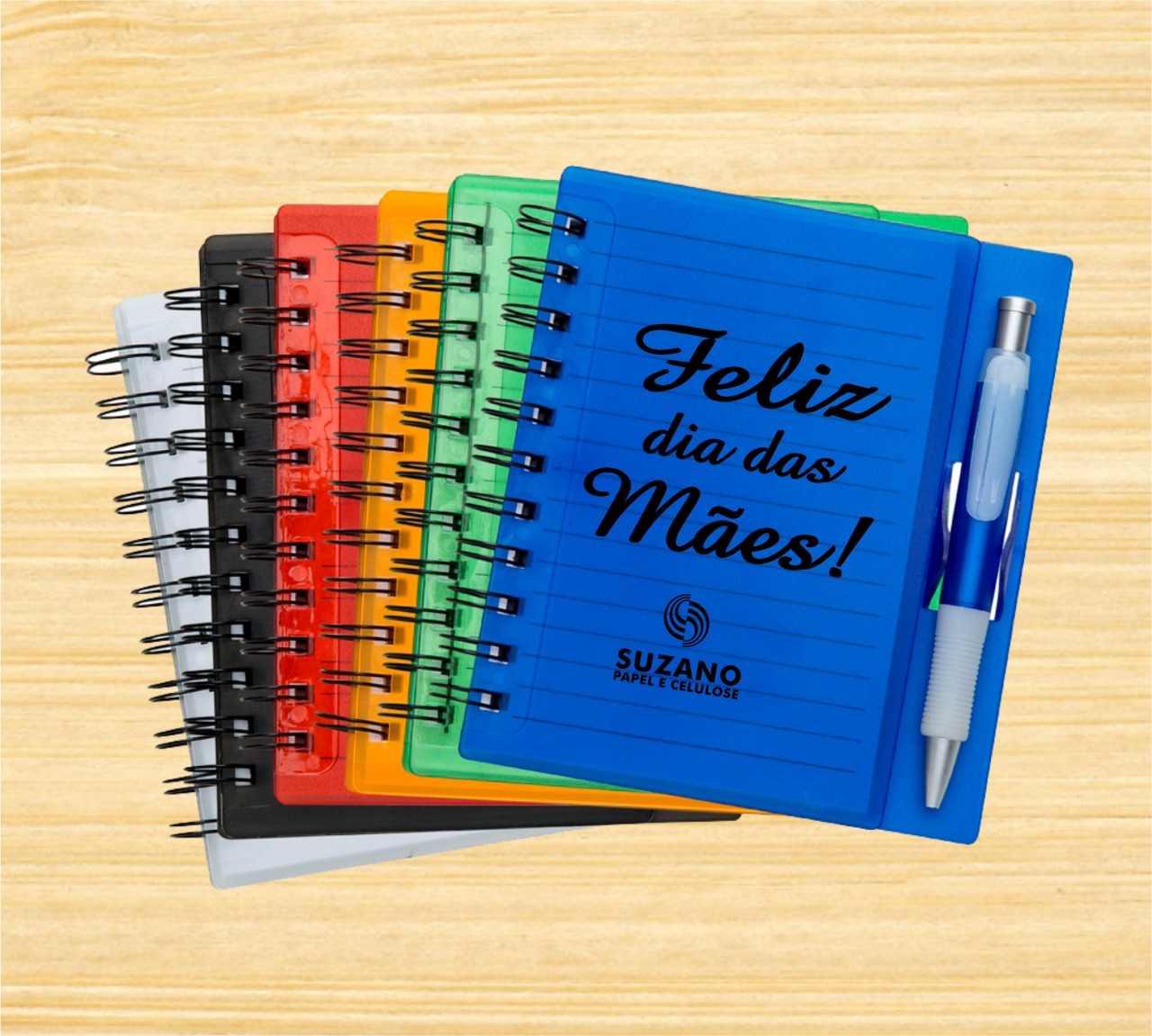 Descrição: Caderneta plástica wire-o com caneta e suporte para encaixe. Caneta plástica com detalhe emborrachado, carga esferográfica na cor azul e acionamento por clique.
