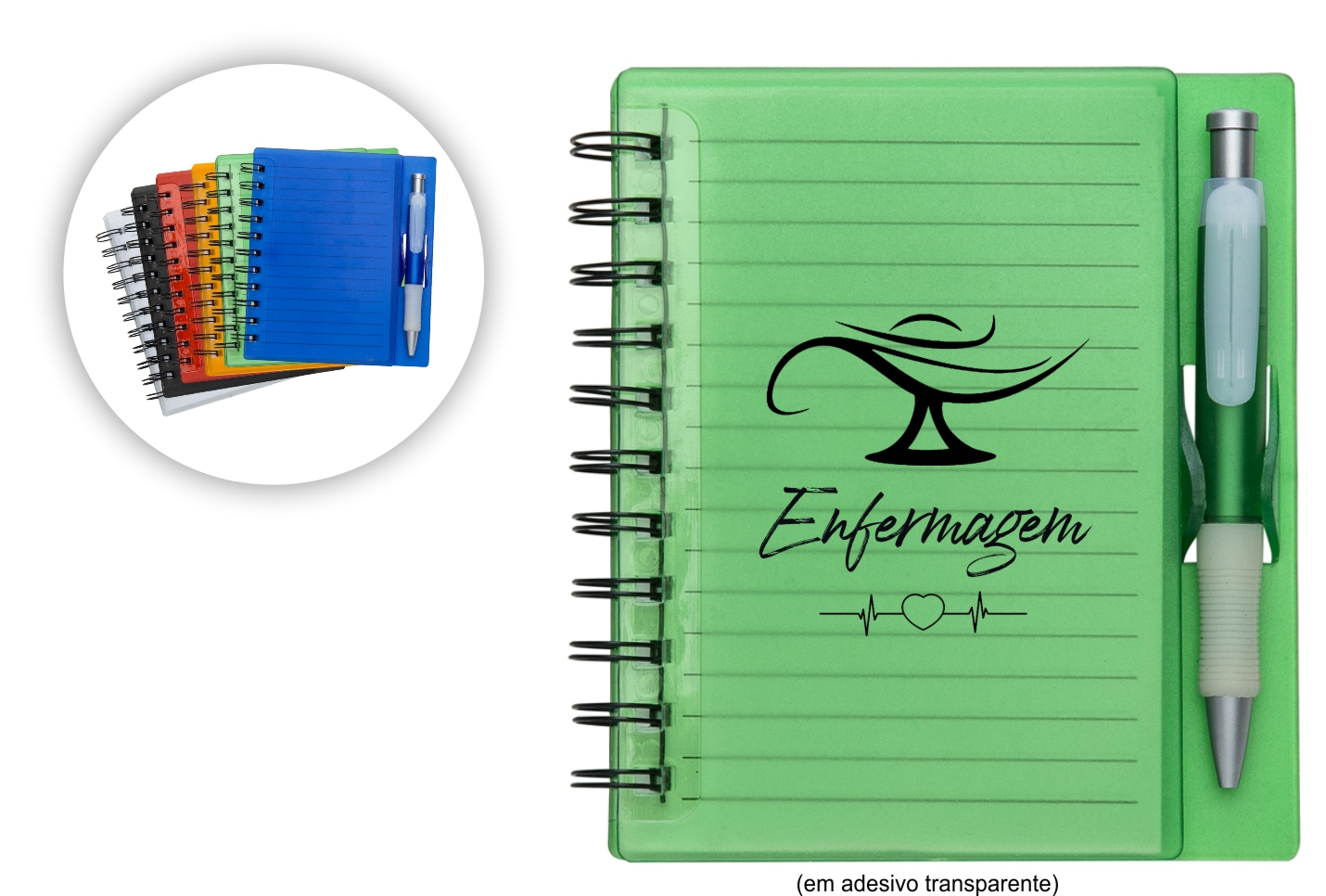 Caderno plástico wire-o com caneta e suporte para encaixe. Caneta plástica com detalhe emborrachado, carga esferográfica na cor azul e acionamento por clique.