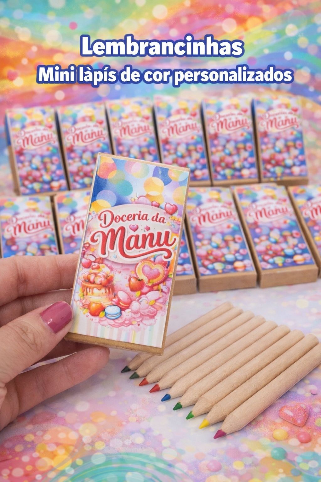 A caixa é feita de cartão resistente e acompanha 10 mini lápis de cor com acabamento natural em madeira clara. Os lápis são de tamanho reduzido, ótimos para crianças e uso em festas. A personalização da caixa é feita conforme o tema escolhido, garantindo um toque especial às lembrancinhas.