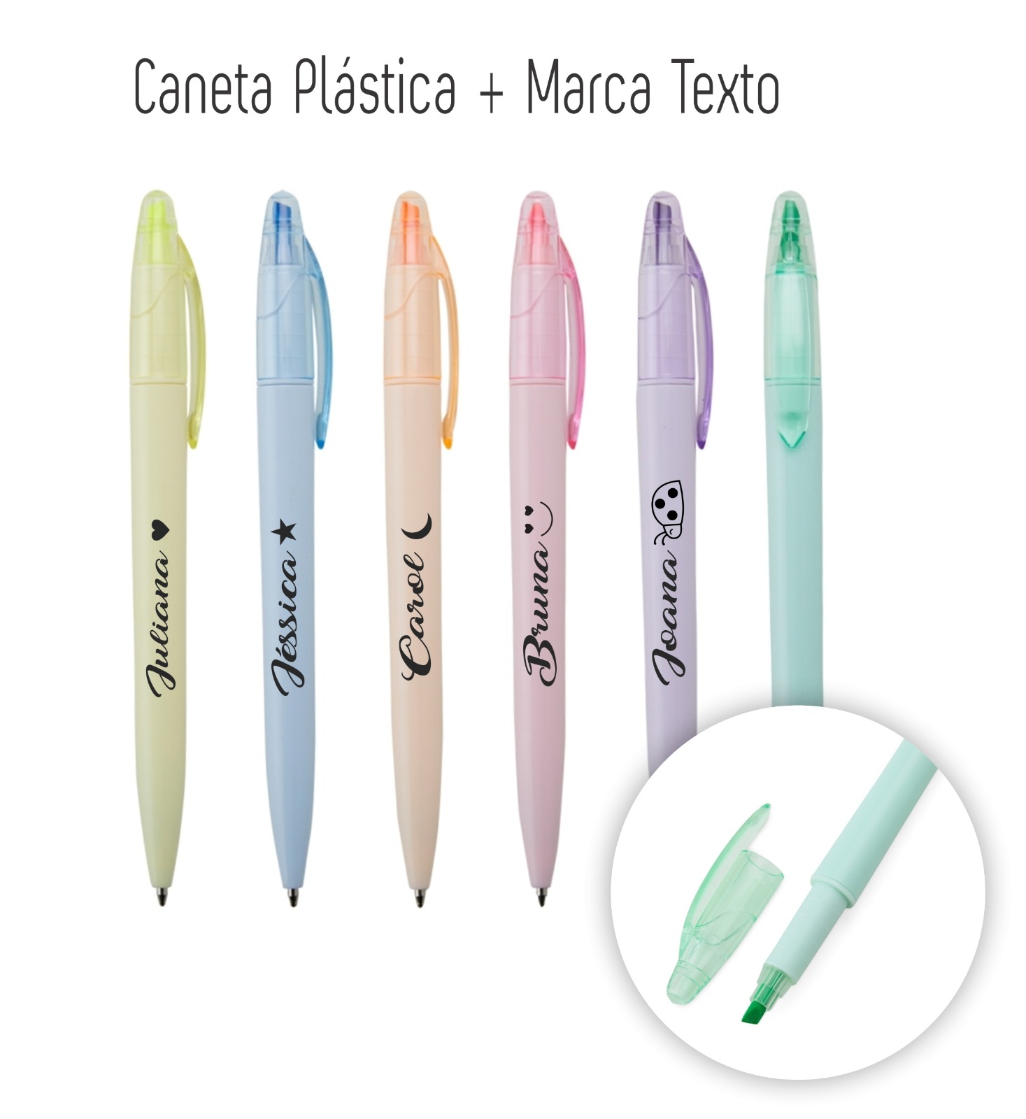 Descrição: Caneta plástica com marca texto com tampa protetora para o marca texto, carga esferográfica azul 1.0mm e acionamento por rotação.