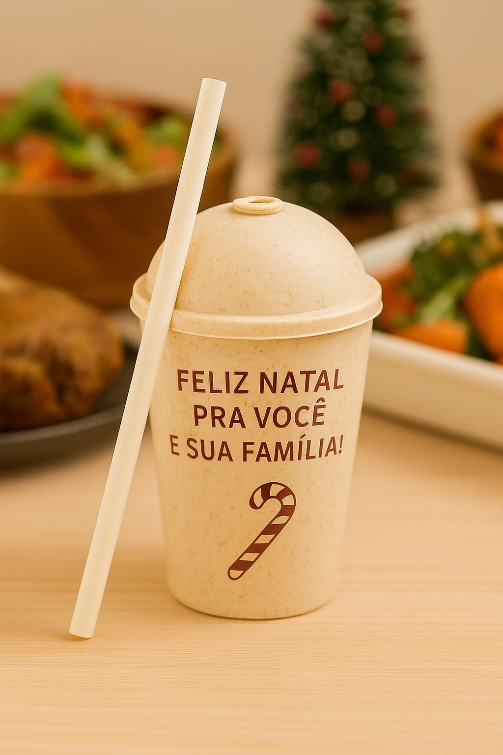 Descrição: Copo produzido em fibra de madeira com tampa e capacidade de até 450ml. Acompanha canudo plástico para encaixe na tampa.