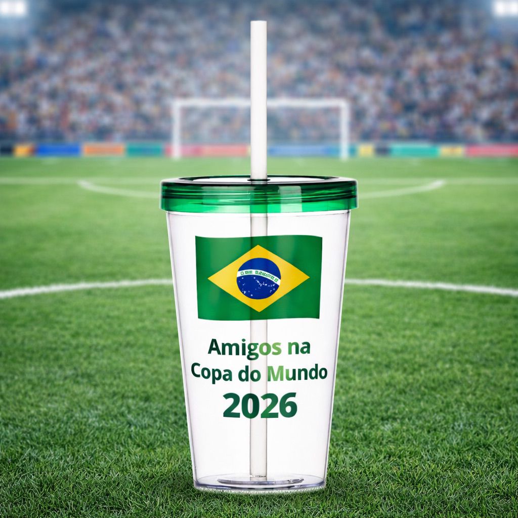 Descrição: Copo plástico de 600ml com tampa rosqueável e canudo biodegradável.