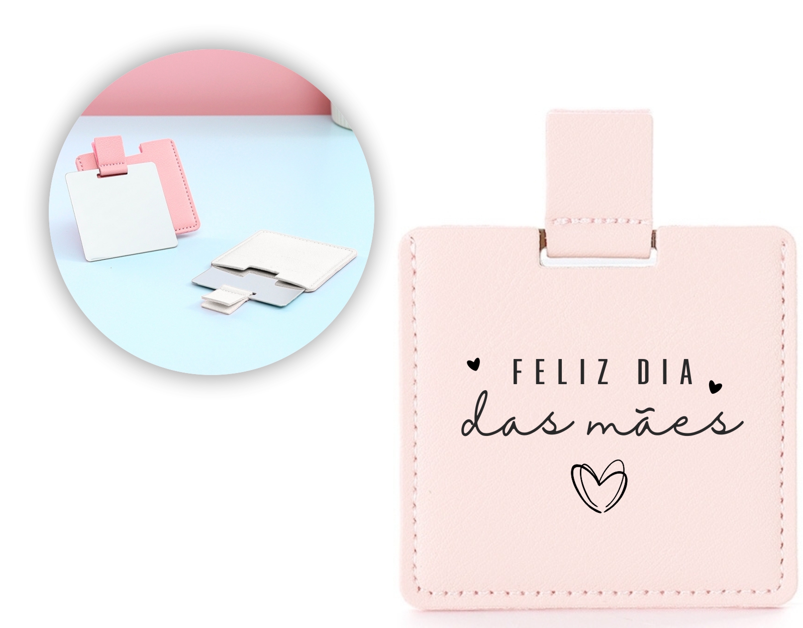 Espelho inquebrável de aço inoxidável ultra fino com verso escovado e alça em couro sintético.