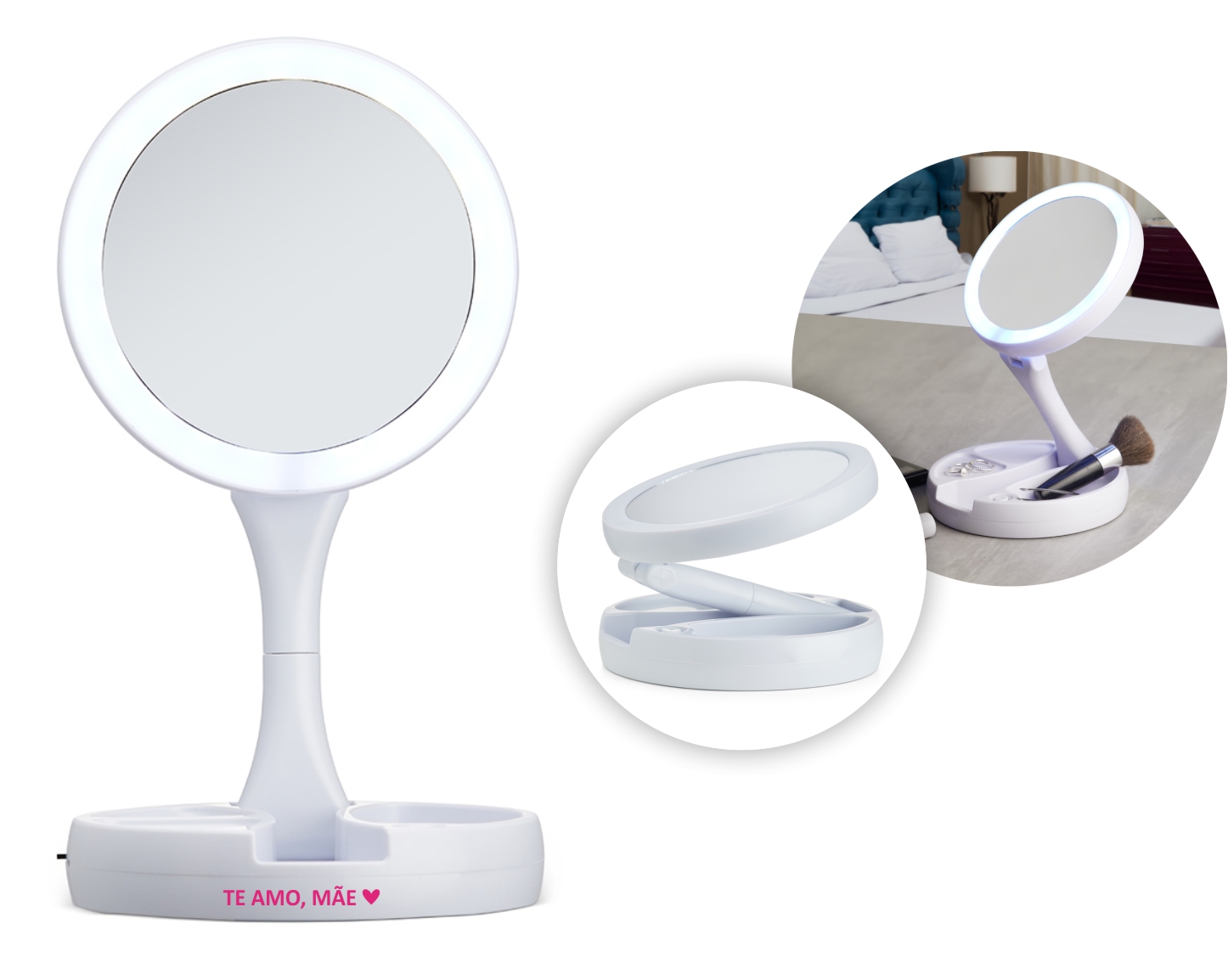 O espelho possui uma das faces ampliada 10x e do outro lado, espelho convencional 1x, iluminação LED dos dois lados, três compartimentos na base para armazenamento de acessórios, espelho giratório e regulável, botão liga/desliga e botão para acionar a iluminação, com funcionamento à base de 4 pilhas AA (não acompanha) ou via cabo USB.