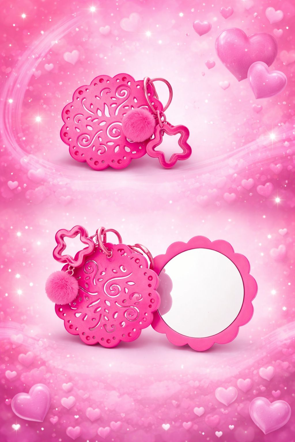 Descrição: Espelho portátil com moldura em plástico ABS e abertura lateral deslizante. Acompanha mosquetão metálico com adereços.
