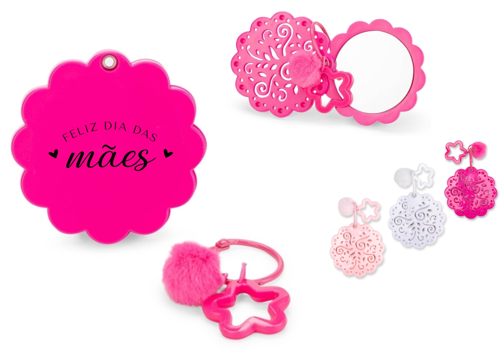 Espelho portátil com moldura em plástico ABS e abertura lateral deslizante. Acompanha mosquetão metálico com adereços.
