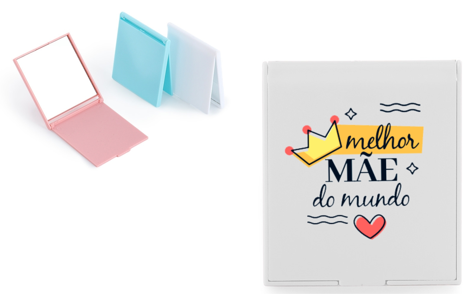 Espelho de vidro sem aumento com moldura arredondada em plástico. A tampa protetora, quando inclinada para trás, funciona como apoio para mantê-lo aberto sobre superfícies planas.