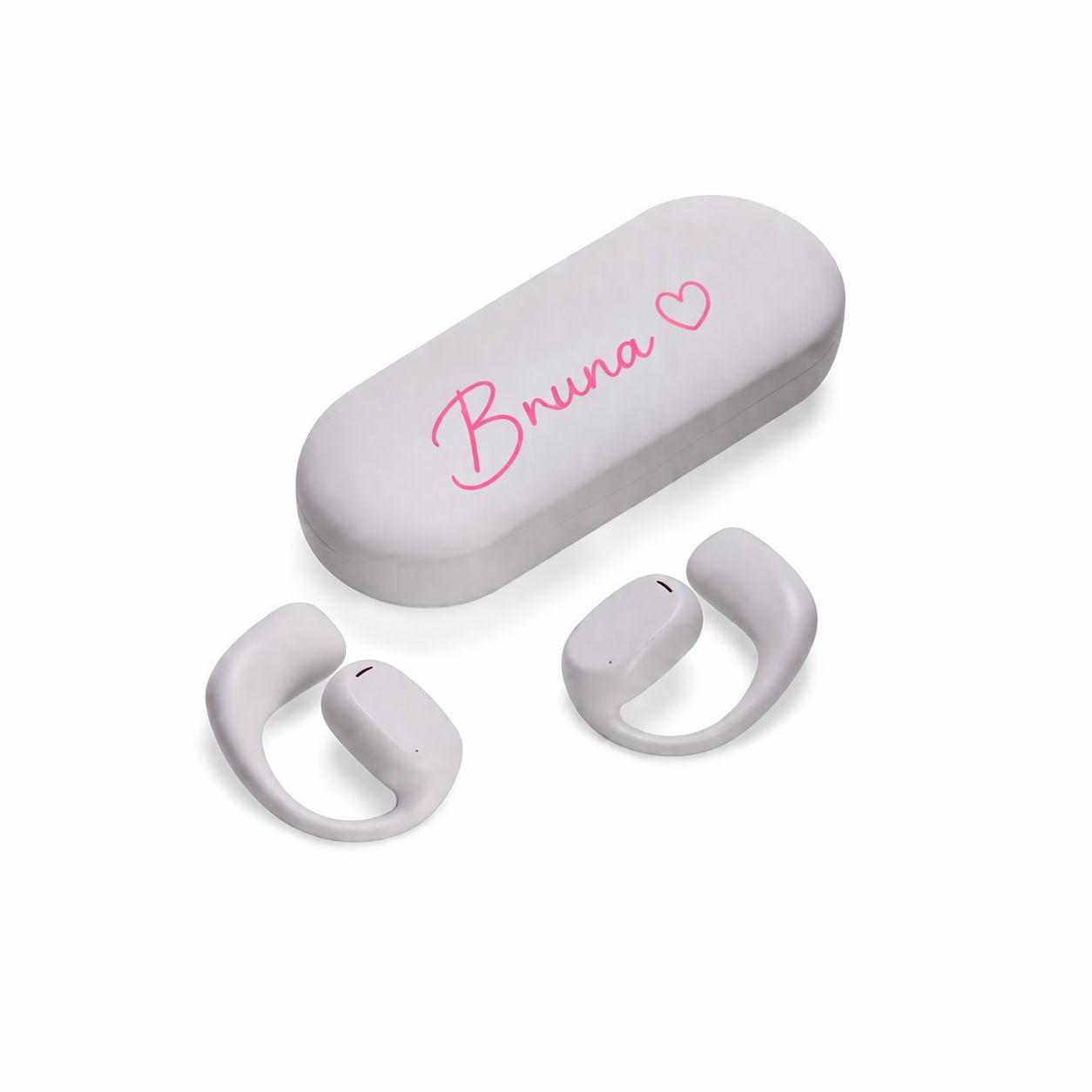 Descrição: Fones de ouvido sem fio com estrutura em plástico. Possuem formato aberto e ergonômico, permitindo o encaixe nas orelhas sem entrar em contato direto com o canal auditivo. Possuem microfone interno para chamadas pelo celular ou WhatsApp. Apresentam conexão via Bluetooth 5.3 que oferece uma transmissão de dados mais estável e com maior qualidade. Acompanha estojo de carregamento com visor de percentual da carga total, além de cabo USB-C para recarga.