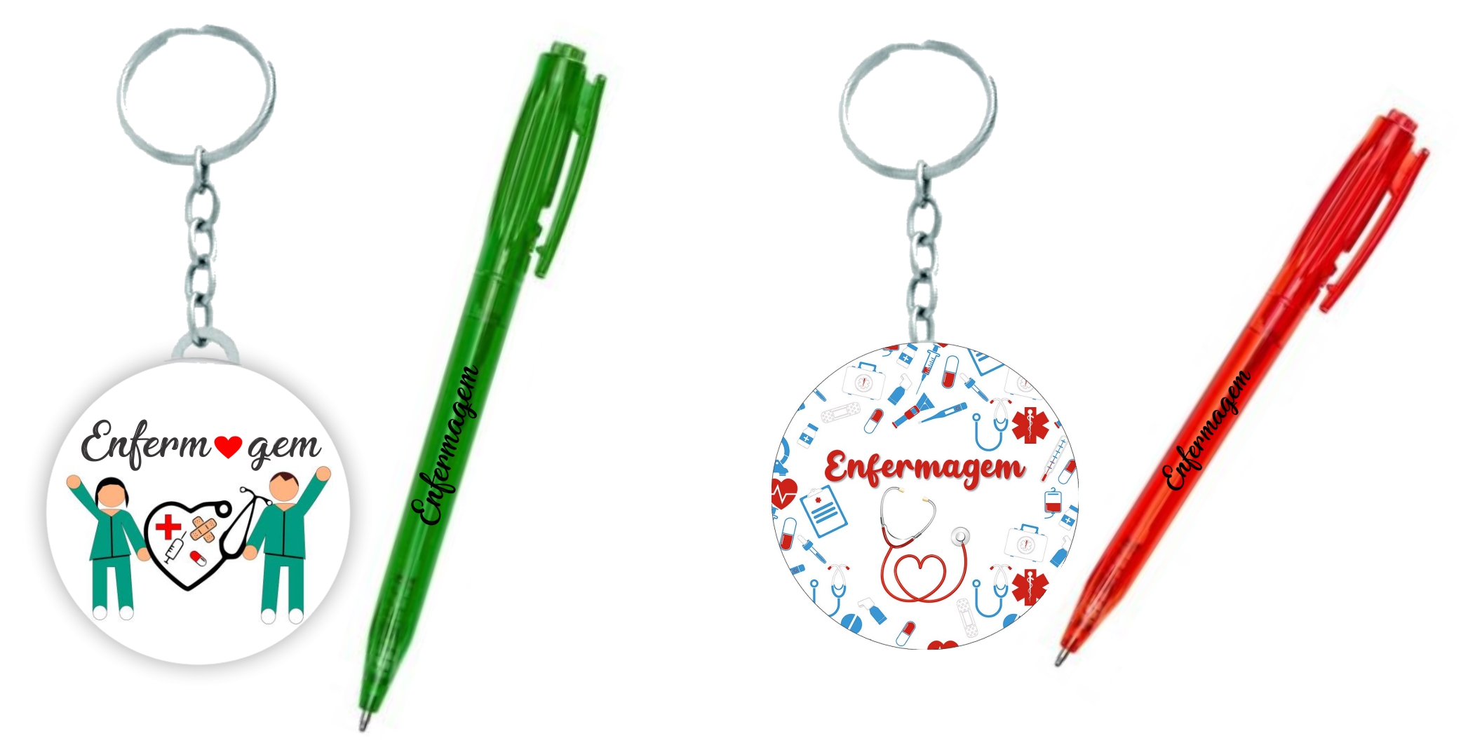 Kit contém 1 chaveiro chapinha metal, com argola e corrente + caneta plástica translúcida com carga esferográfica azul 1.0 mm e acionamento por clique.