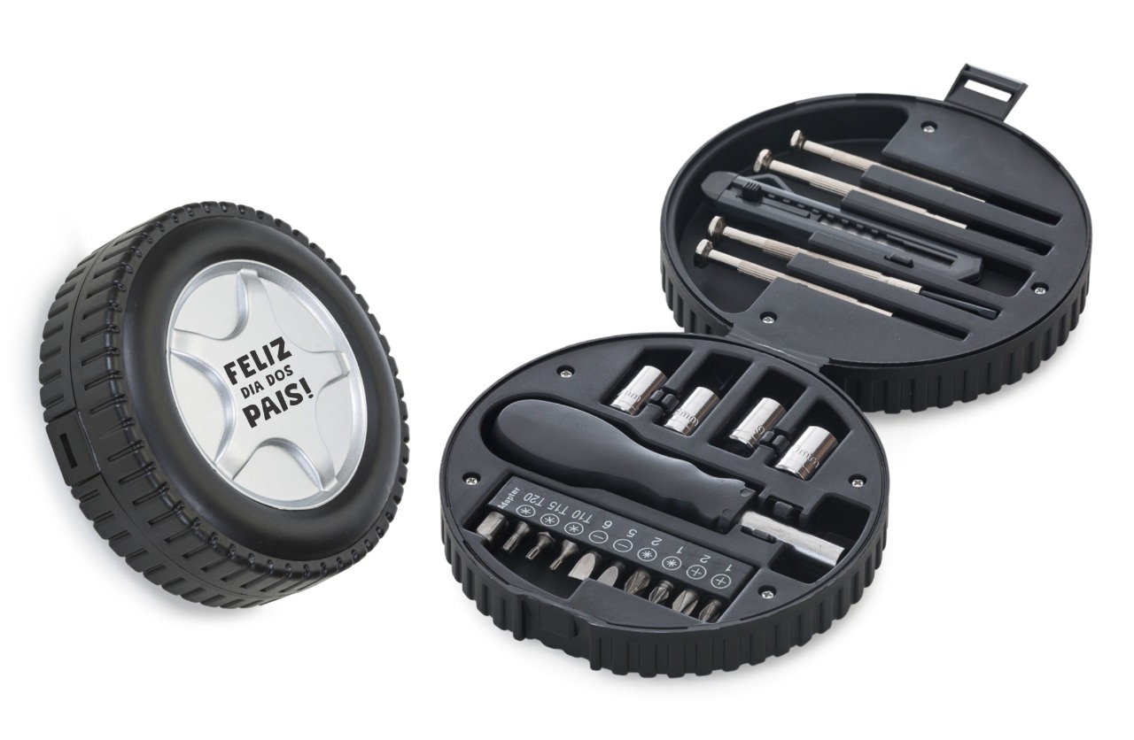 Kit ferramenta 20 peças com estojo formato pneu em plástico resistente. Pneu preto com aro prata, possui trava lateral. Contém: 2 mini chaves de fenda e 2 mini chaves phillips, estilete, 4 extensores bocais(7MM, 8MM, 9MM e 10MM), chave canhão e conjunto 10 pontas(4 chaves phillips, 2 chaves fenda, 3 chaves torx e um adaptador).