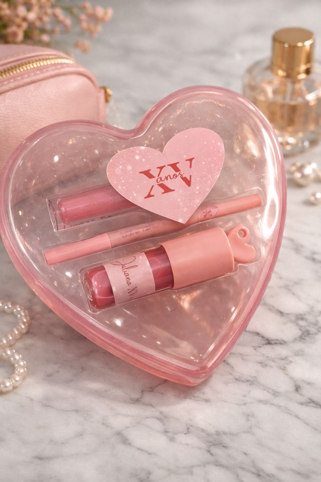 Especificações técnicas: O kit conta com um gloss transparente que hidrata e dá brilho natural, um gloss com cor para realçar a tonalidade dos lábios e um lápis de boca para contorno preciso. A embalagem é em acrílico no formato de coração, cor rosa translúcido, tamanho compacto para fácil transporte. Ideal para quem busca uma lembrança sofisticada e funcional em festas.