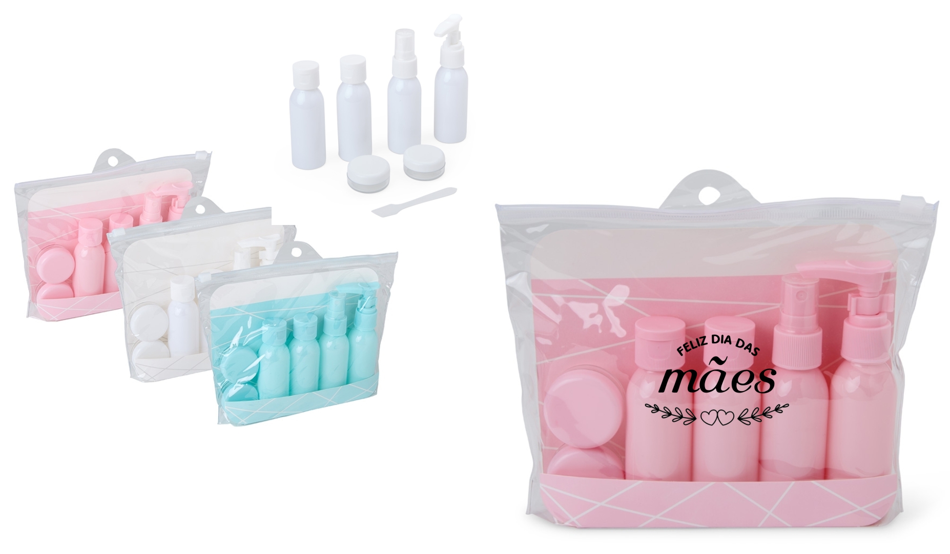 Kit de viagem com seis itens em plástico, incluindo: um frasco pump de 50ml, um frasco spray de 50ml, dois frascos com tampa rosqueável de 50ml e dois pote com 5ml de capacidade.