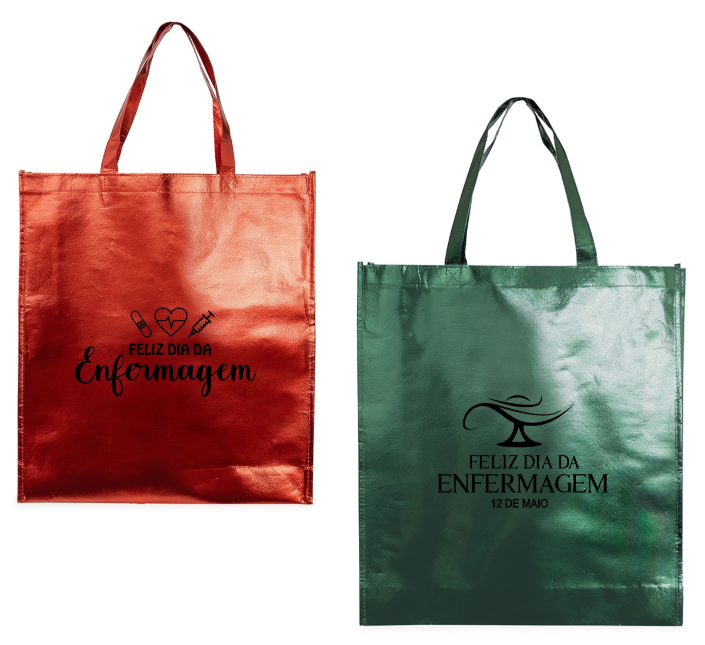 Sacola em TNT com revestimento externo laminado e duas alças costuradas.
