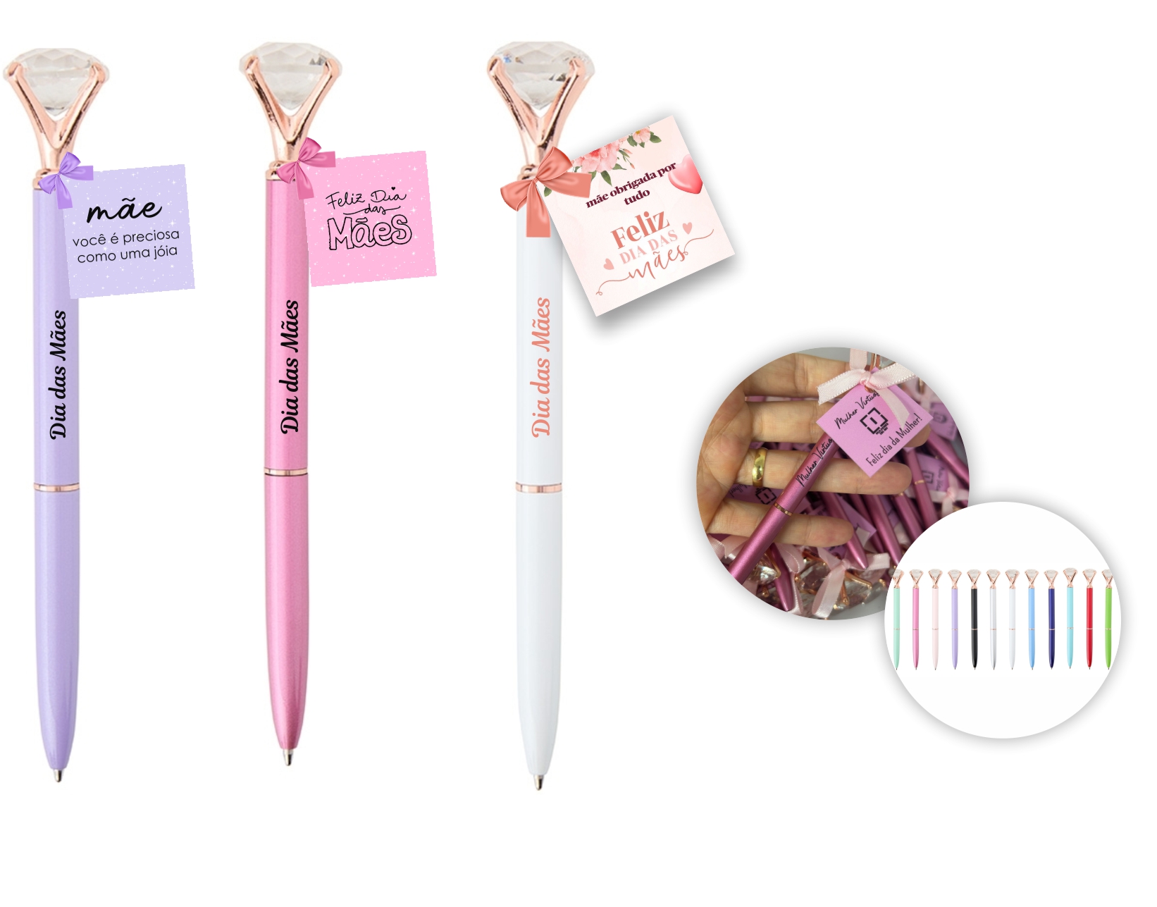 Contém 1 caneta metálica com detalhe decorativo de diamante, Com carga esferográfica azul 1.0mm e acionamento por rotação, proporcionando uma escrita segura e impecável.