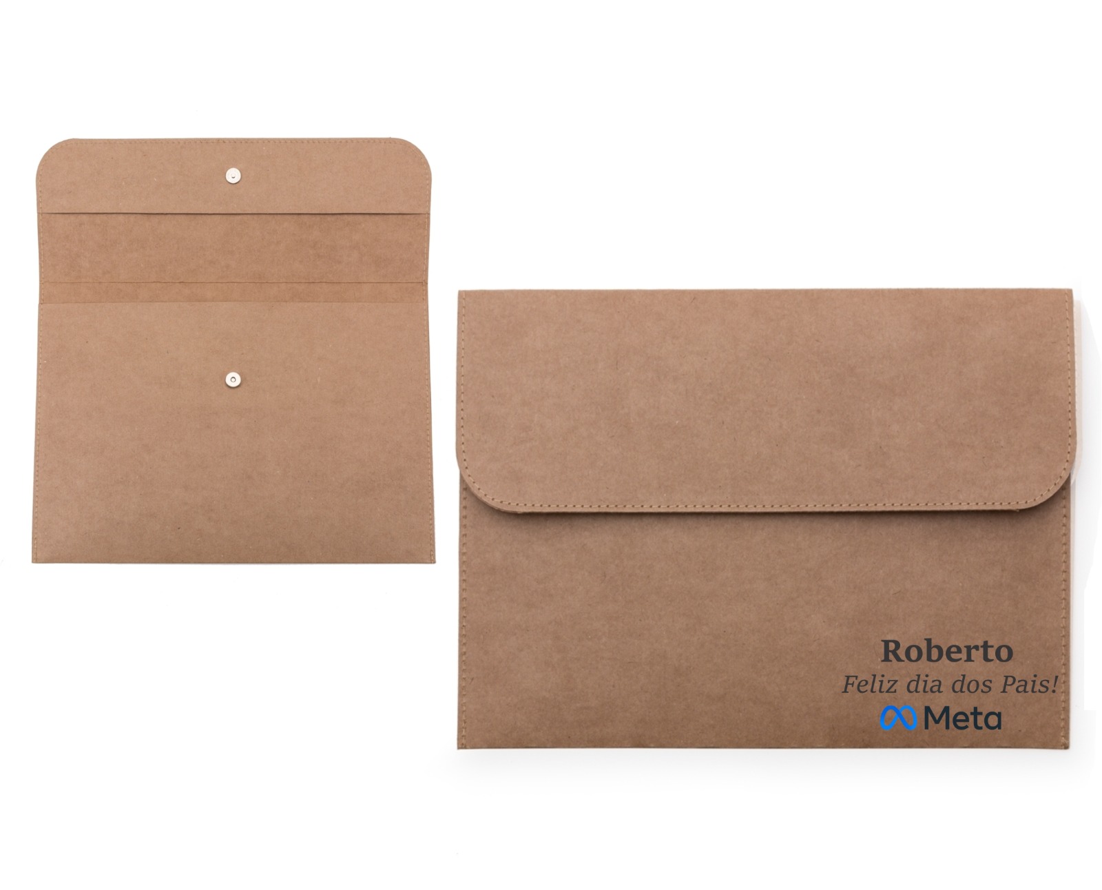 Descrição: Pasta envelope ecológica, possui abertura superior fixada por um botão imantado. Detalhes costurados nas laterais, material em kraft.