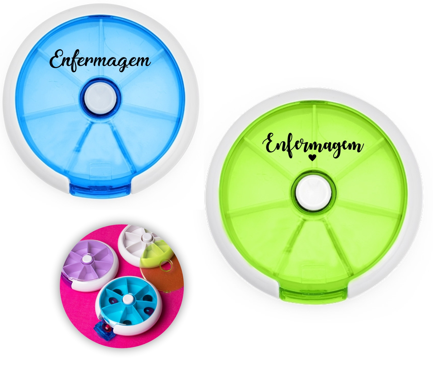 Porta-comprimidos em plástico. Com design compacto, possui sete divisórias e um botão de acionamento que movimenta o mecanismo de giro de compartimentos a cada clique.permitindo o acesso ao conteúdo por meio de uma abertura lateral