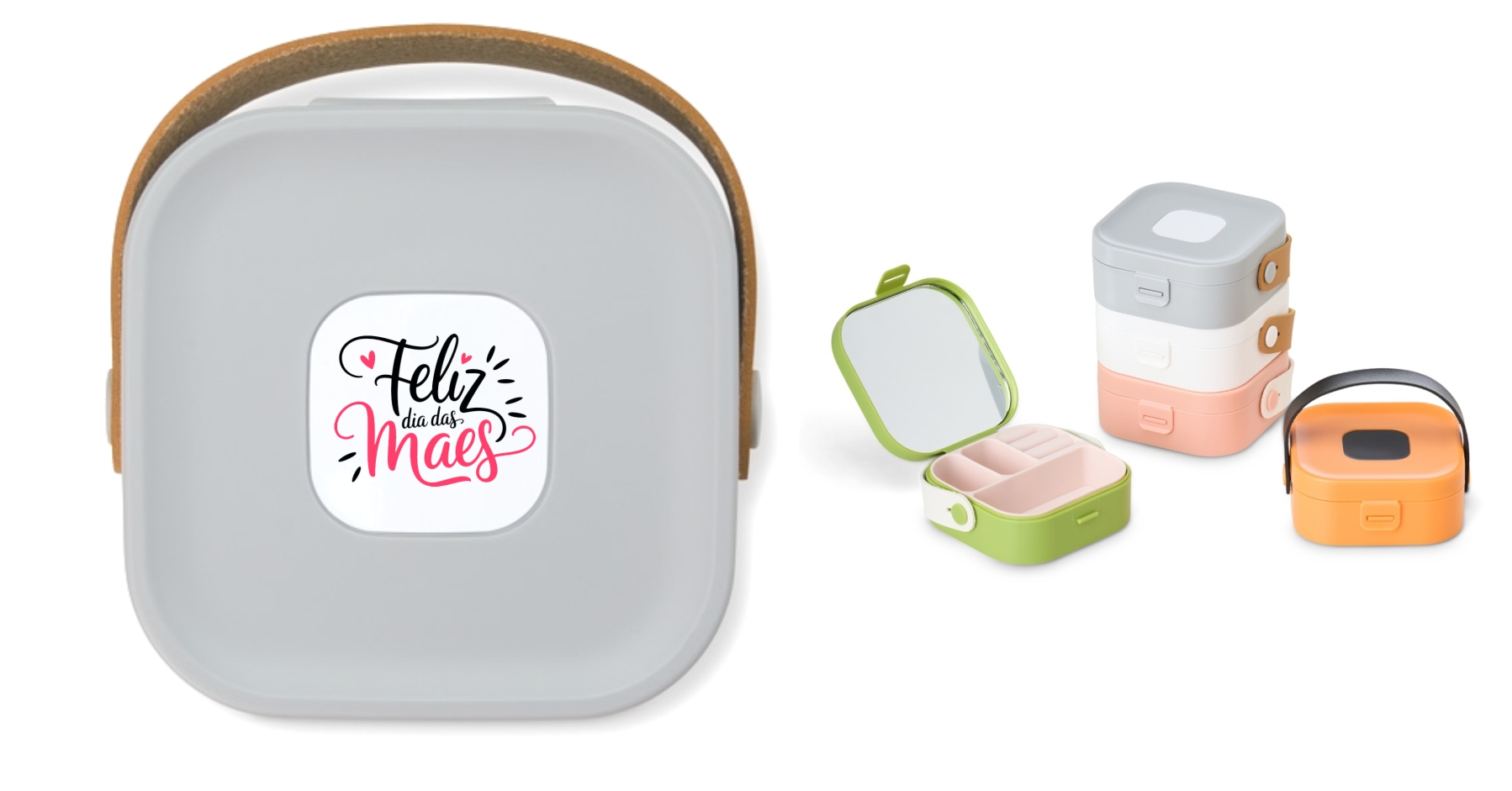 Porta-joias com espelho, produzido em plástico com alça de couro sintéticoe berço de silicone removível.