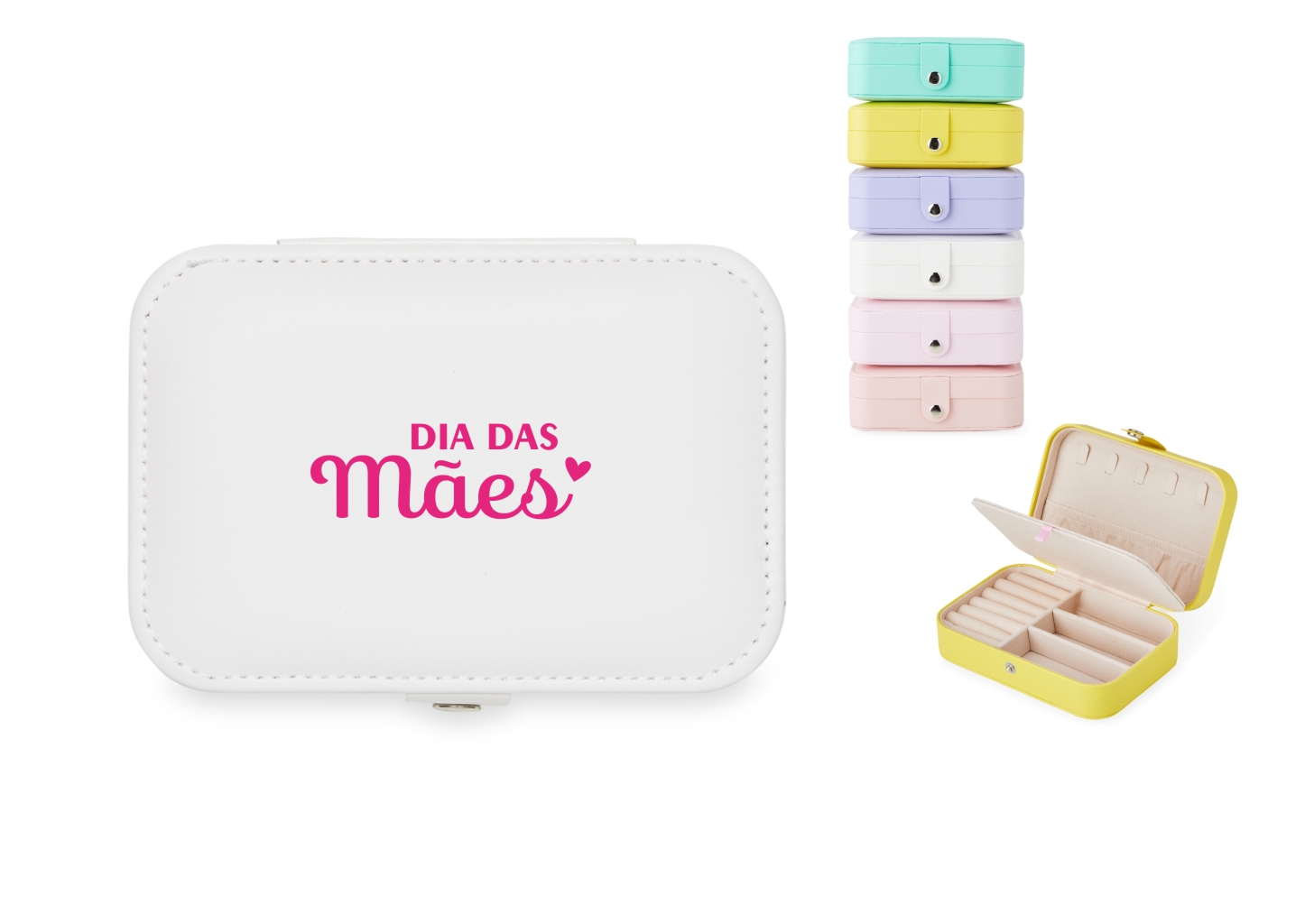 Possui compartimentos internos para anéis, pulseiras, colares e placa para brincos.