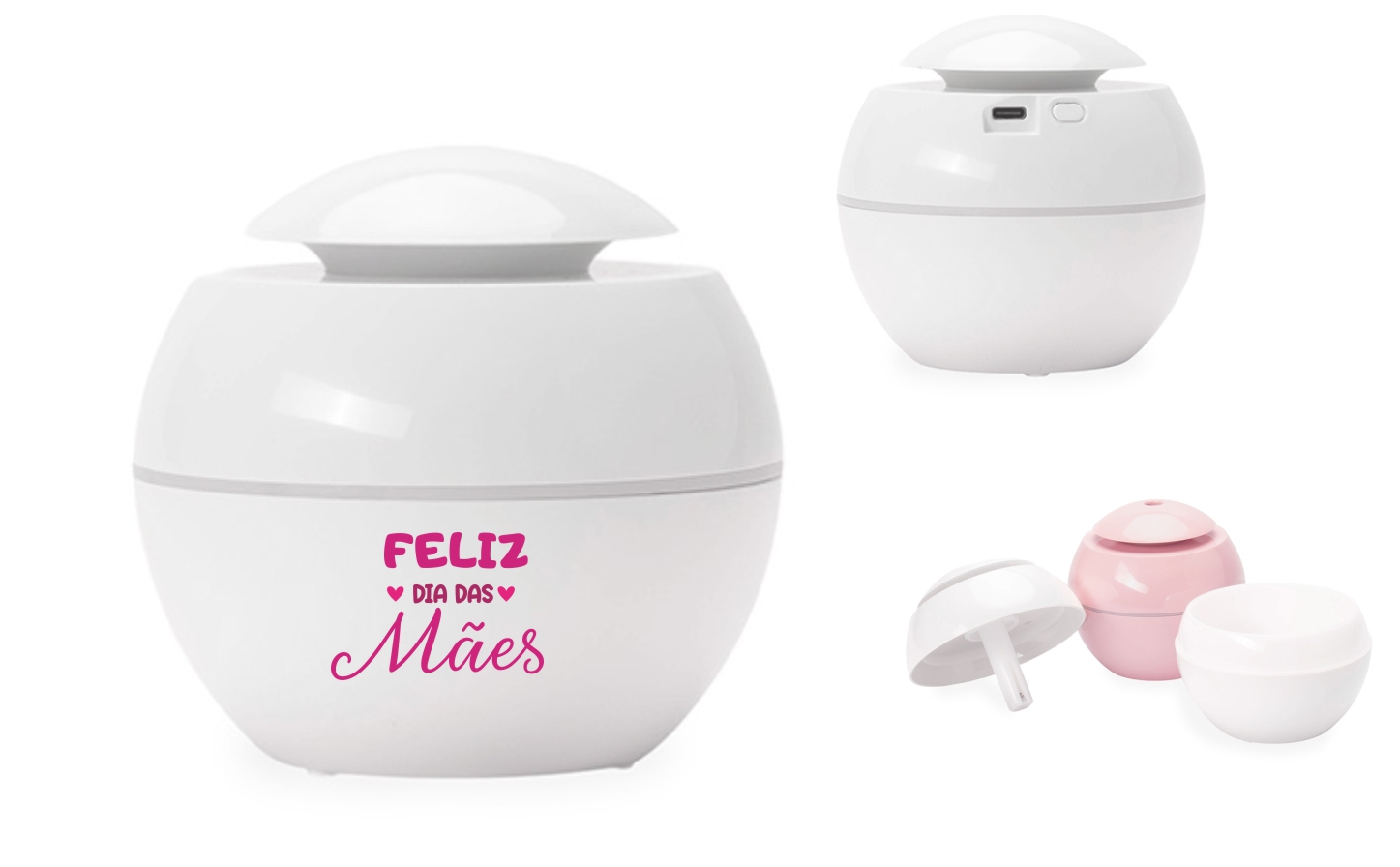Umidificador de ar com construção em plástico, iluminação LED e reservatório de água com capacidade de até 200ml.